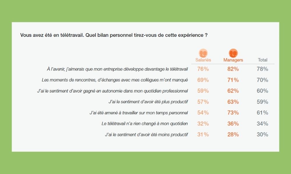 L’adaptation au mode de travail à distance a été convaincante puisque 78% des salariés souhaitent davantage de télétravail. 6 salariés sur 10 déclarent avoir gagné en autonomie grâce à ce changement de mode de travail. En revanche, les RH et managers devront veiller au bon maintien des liens sociaux dans la poursuite du télétravail : 7 salariés sur 10 regrettent la convivialité du mode présentiel.