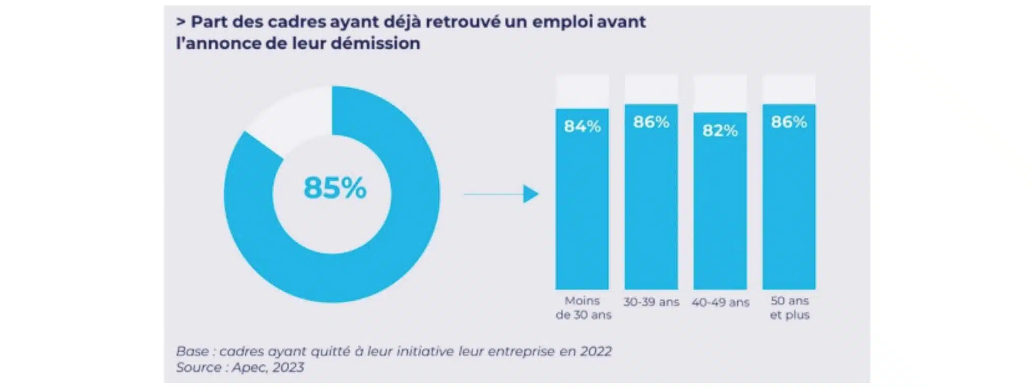 D’après une étude de l’Apec réalisée en 2023, près de 9 cadres sur 10 annoncent leur démission après avoir trouvé un nouvel emploi, davantage en adéquation avec leurs attentes. Ce nouveau travail est trouvé le plus souvent après avoir candidaté (pour 1 cadre sur 2).