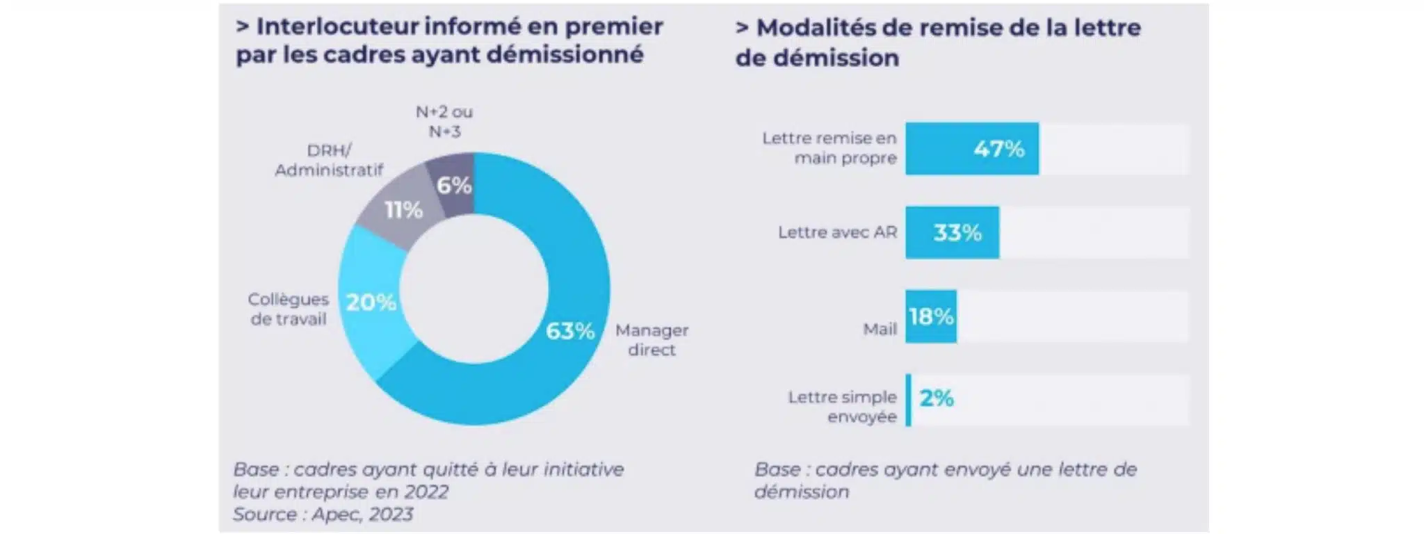 Cette décision se formalise par la lettre de démission, avant tout destinée aux services RH et aux managers directs. Dans 47 % des cas, elle a été remise en main propre. Dans 33% des cas, elle a été envoyée avec un accusé de réception et enfin, transmise par mail pour 18% des cadres.