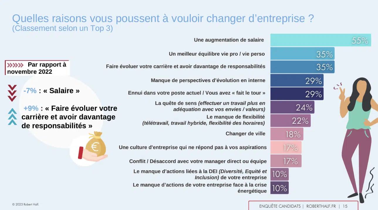 Selon une récente enquête Robert Half, parmi les raisons qui poussent les salariés à vouloir changer d’entreprise, figure en tête de liste l’augmentation de salaire, suivie de près par la nécessité d’améliorer le work-life balance (équilibre des temps de vie), et celle consistant à faire évoluer sa carrière.